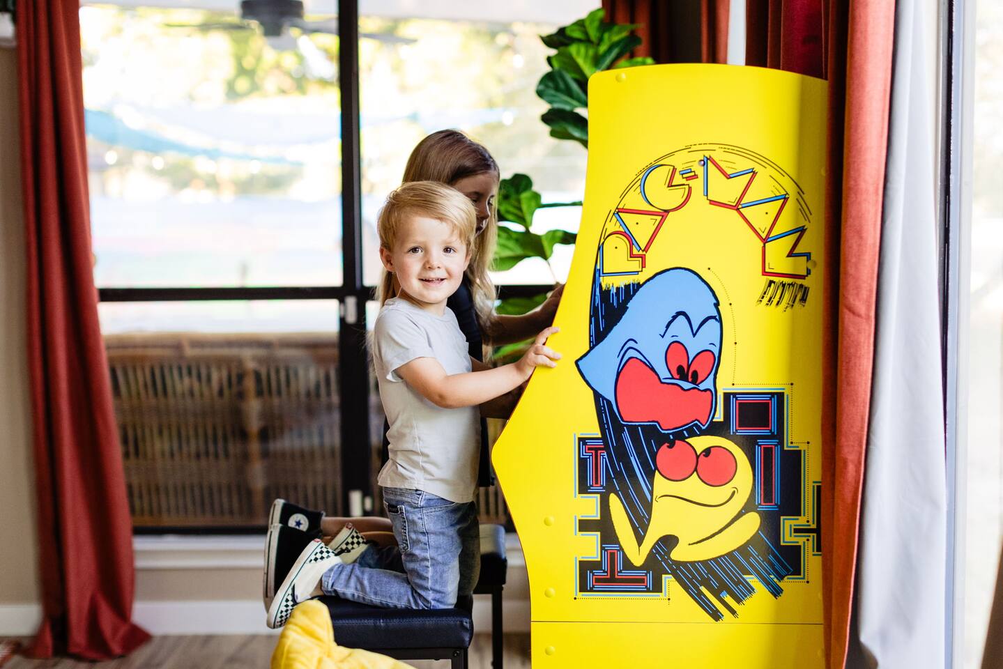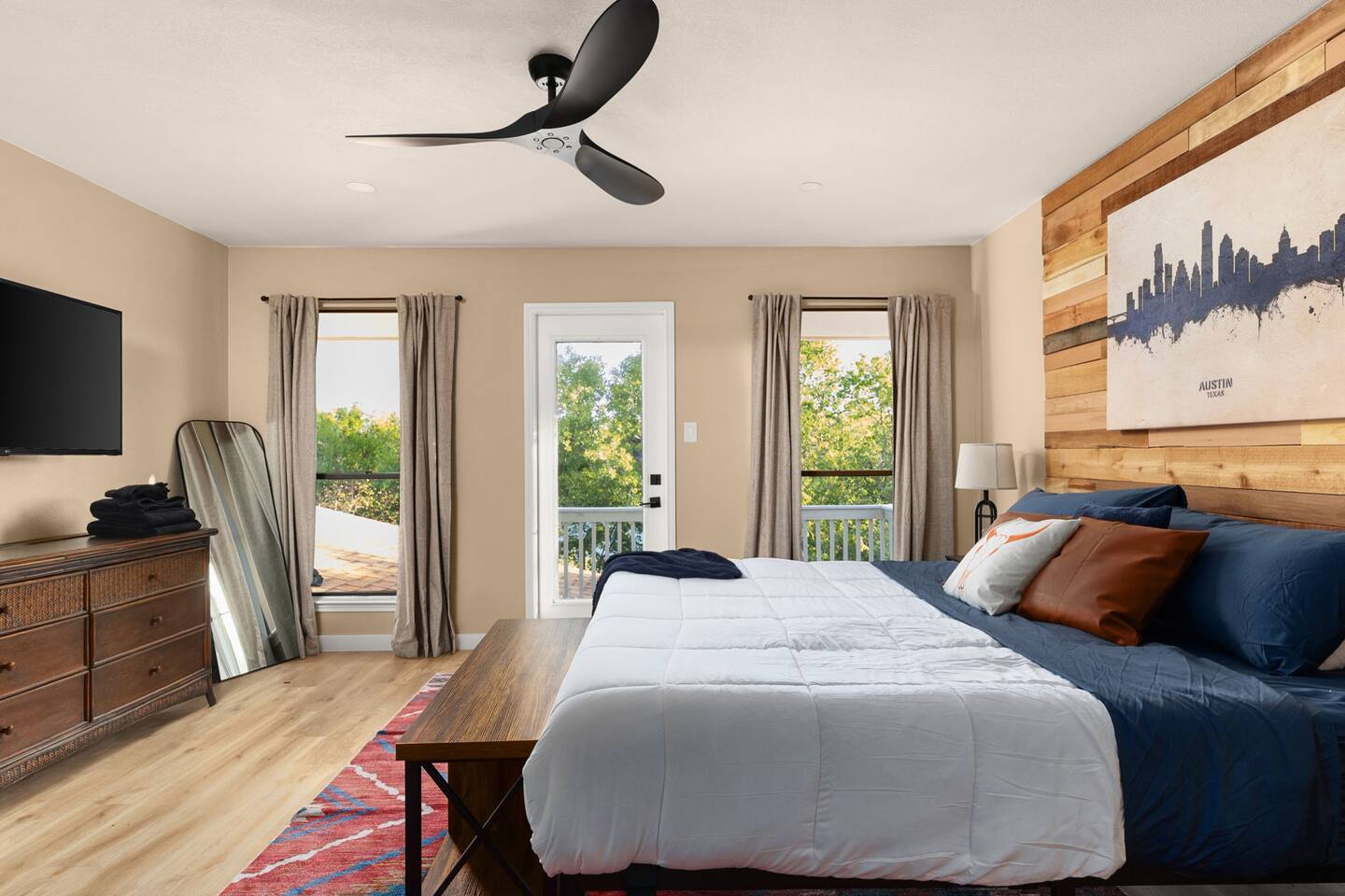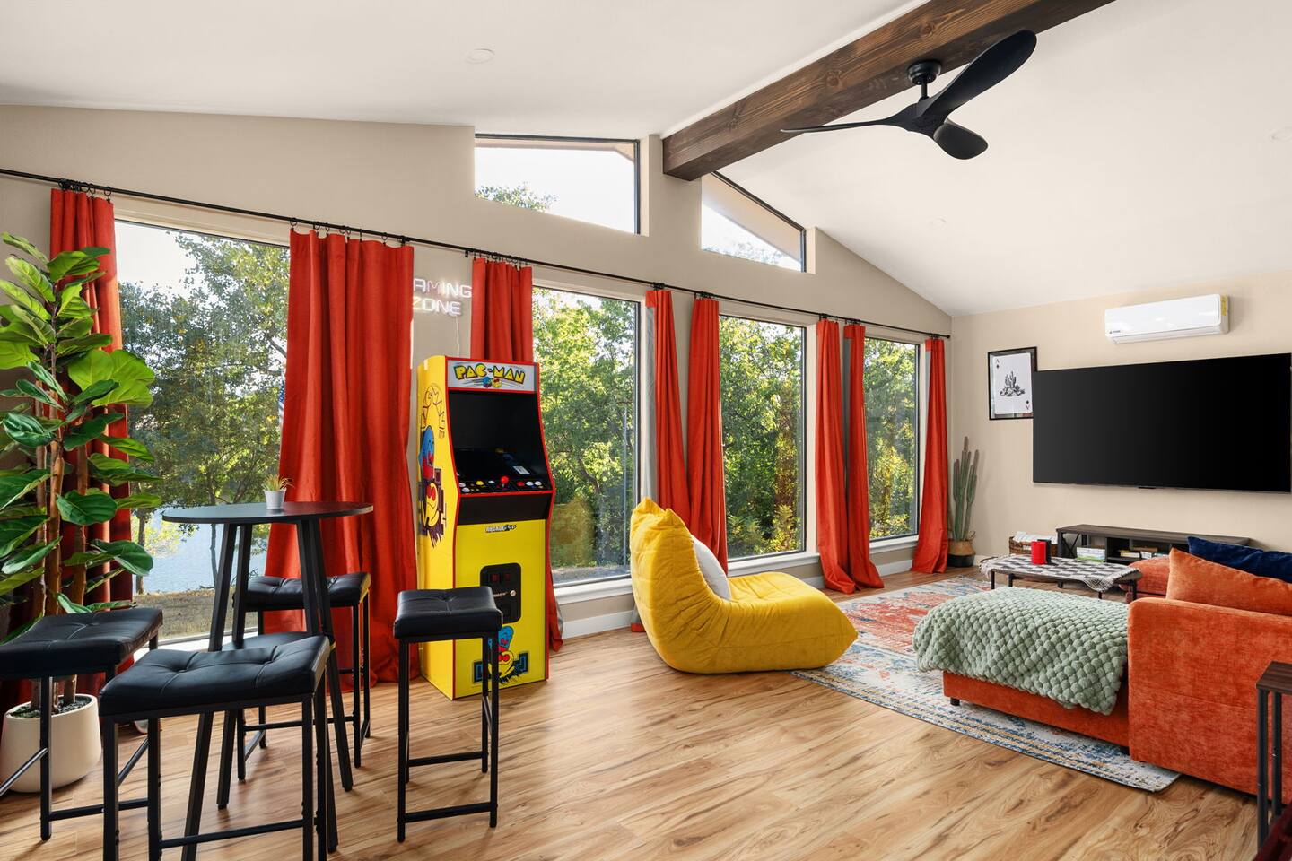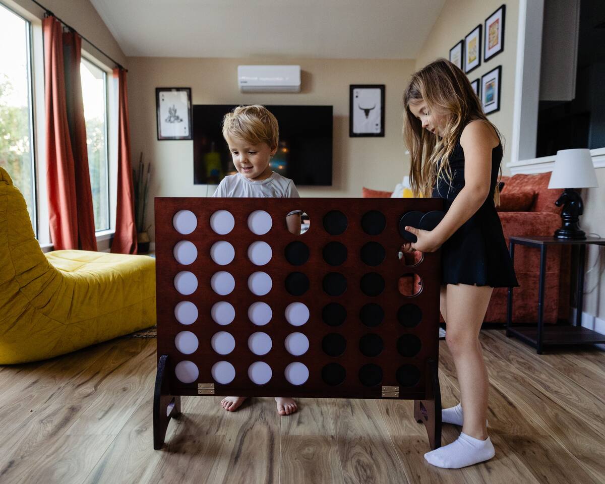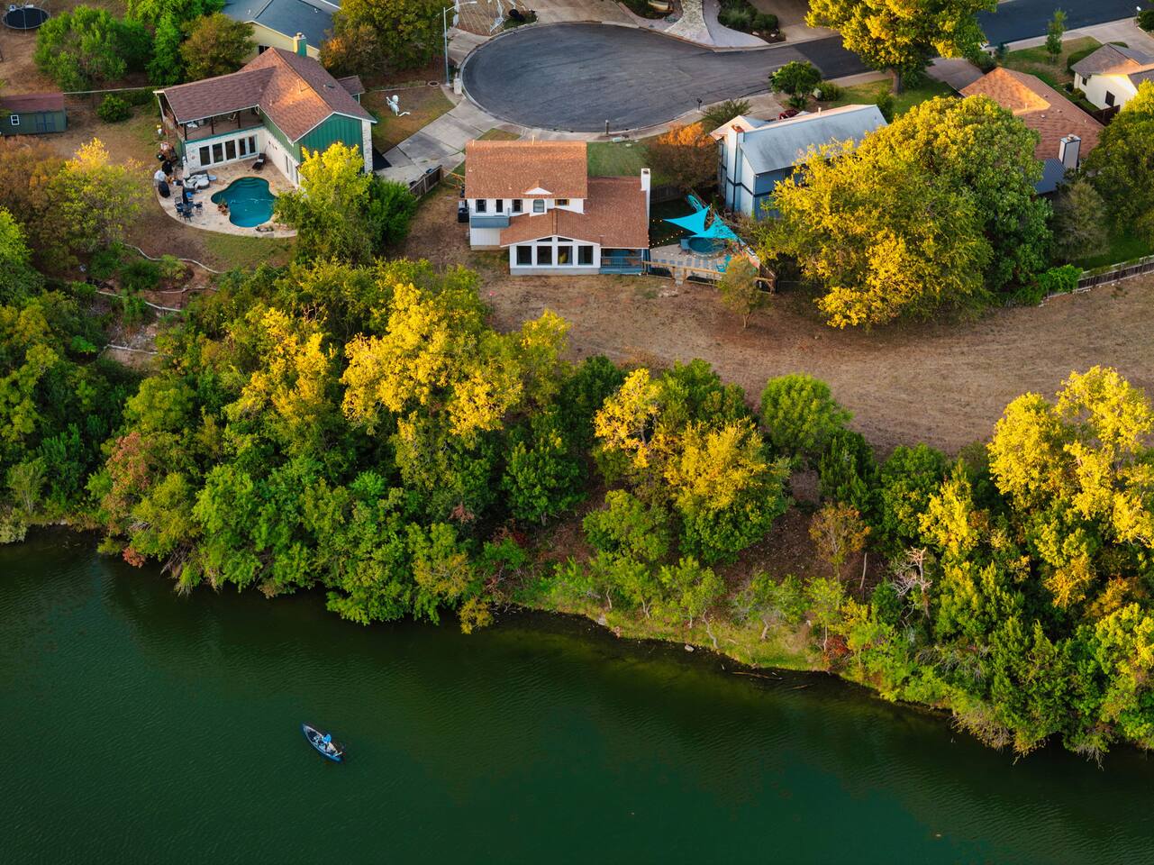 LAKE ACCESS!!! This property is located on the Austin quarry near the domain. It is the only property with direct access to the quarry. You have access to fishing, paddle boarding, and a lot of room for kids to run around. Please note that the quarry belongs to the church who has graciously offered to allow our guest access- using the water they ask for a small donation which we can collect from guests. You’ll walk into the living room to find a TV and a fireplace. There is a sunroom with a TV, an arcade and a couch that doubles as a bed. Bedrooms: The upstairs master has a king size bed, and en suite bathroom There is a room with a queen size bed There is another room with a double queen, bed, and a trundle pullout bed, which is perfect for kids. The saloon also has a Murphy bed queen size. The living room has a futon and an air mattress. Bathrooms: There is a half bath downstairs and a full shared bathroom in the hallway upstairs and the master bathroom has its own dedicated bathroom as well