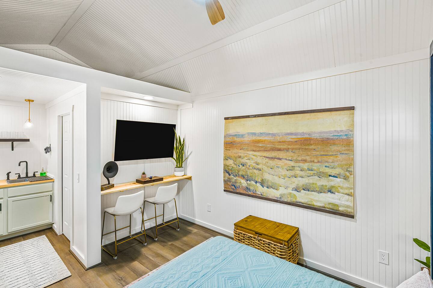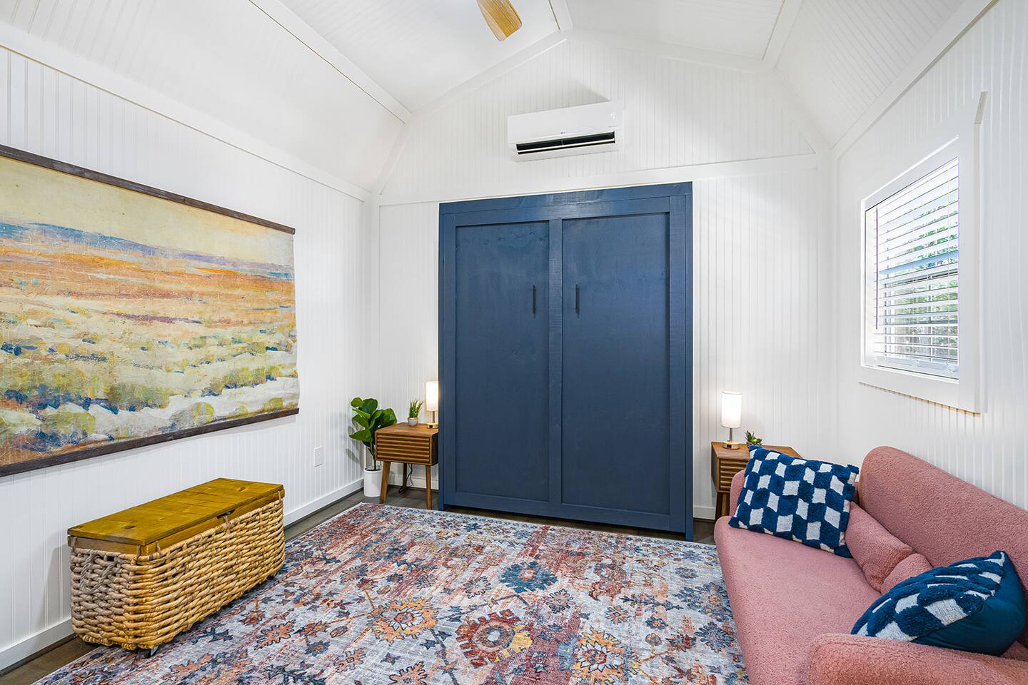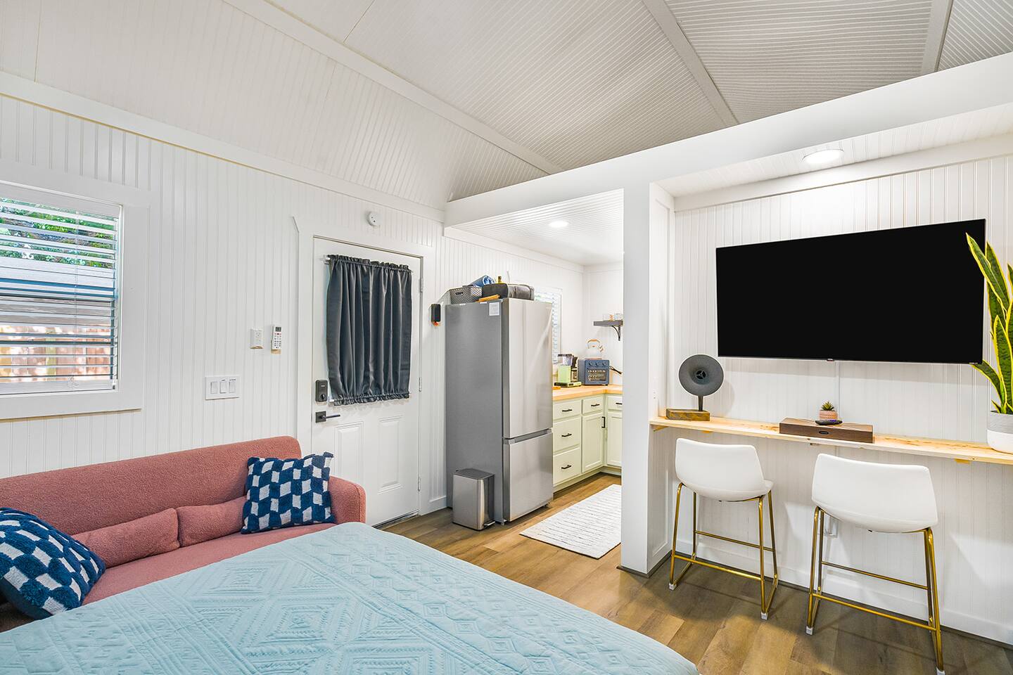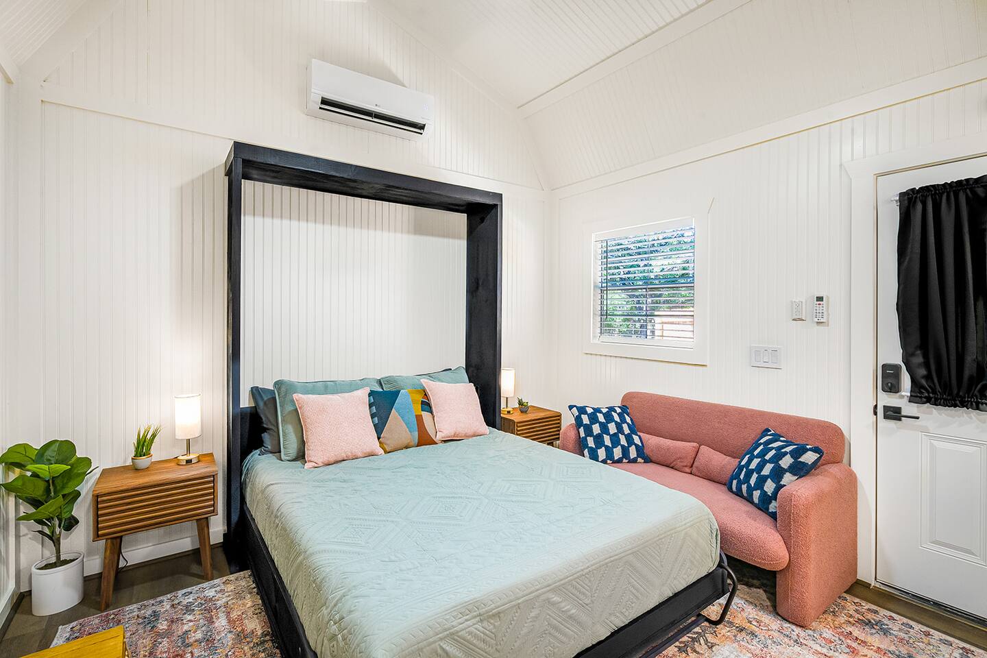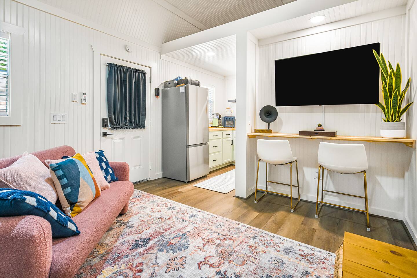 This luxurious tiny home is located in a peaceful Hill Country area in dark sky territory conveniently close to Wimberley, Dripping Springs, and all the surrounding Hill Country destinations. Come and relax with a custom built queen sized murphy bed, that folds up so you can enjoy even more space in this amenity packed tiny home. The 50" Smart TV and wifi access allows you to stream movies, shows and more before you fall asleep. Our kitchen boasts filtered water on a rainwater system, eco-friendly and delicious. We have a mini oven, induction stovetop, top of the line mocha-master coffee maker with fresh ground coffee from local shops, and all the needed kitchen accouterments for a delicious night in. Outside, we have a fire pit, and enough fenced in room for fido to run around (pet friendly), a state of the art blackstone griddle for grilling out, and nearly 3 and a half sprawling acres for you to roam. The property also includes two other unique spaces (a Cottage and Luxury RV), perfect for larger groups or additional privacy. These spaces can be rented separately or together, offering flexibility for your stay. The Cottage is the main house and faces in the opposite direction from the Tiny Home, the RV site has privacy fencing, and the Tiny Home has its own space altogether offering its own privacy if rented alone. The property also has a separate fenced in dog area, a community garden, and is teeming with wildlife to make your stay an enchanting and romantic visit into nature. Don't be surprised if you see deer or other wildlife as they are not shy in this part of the country!