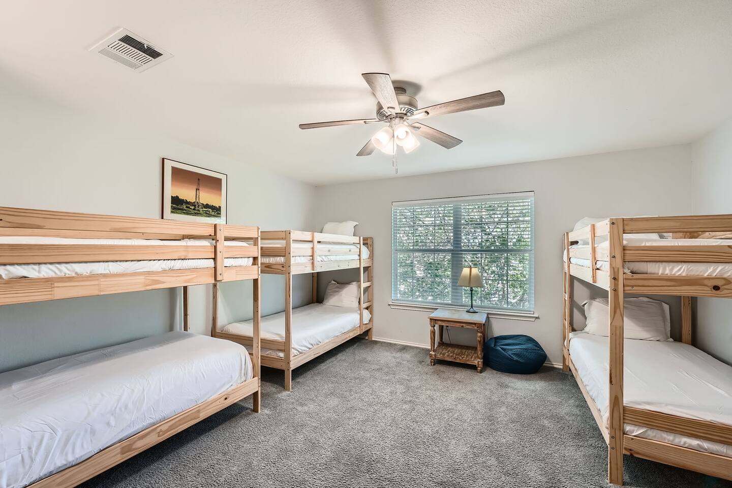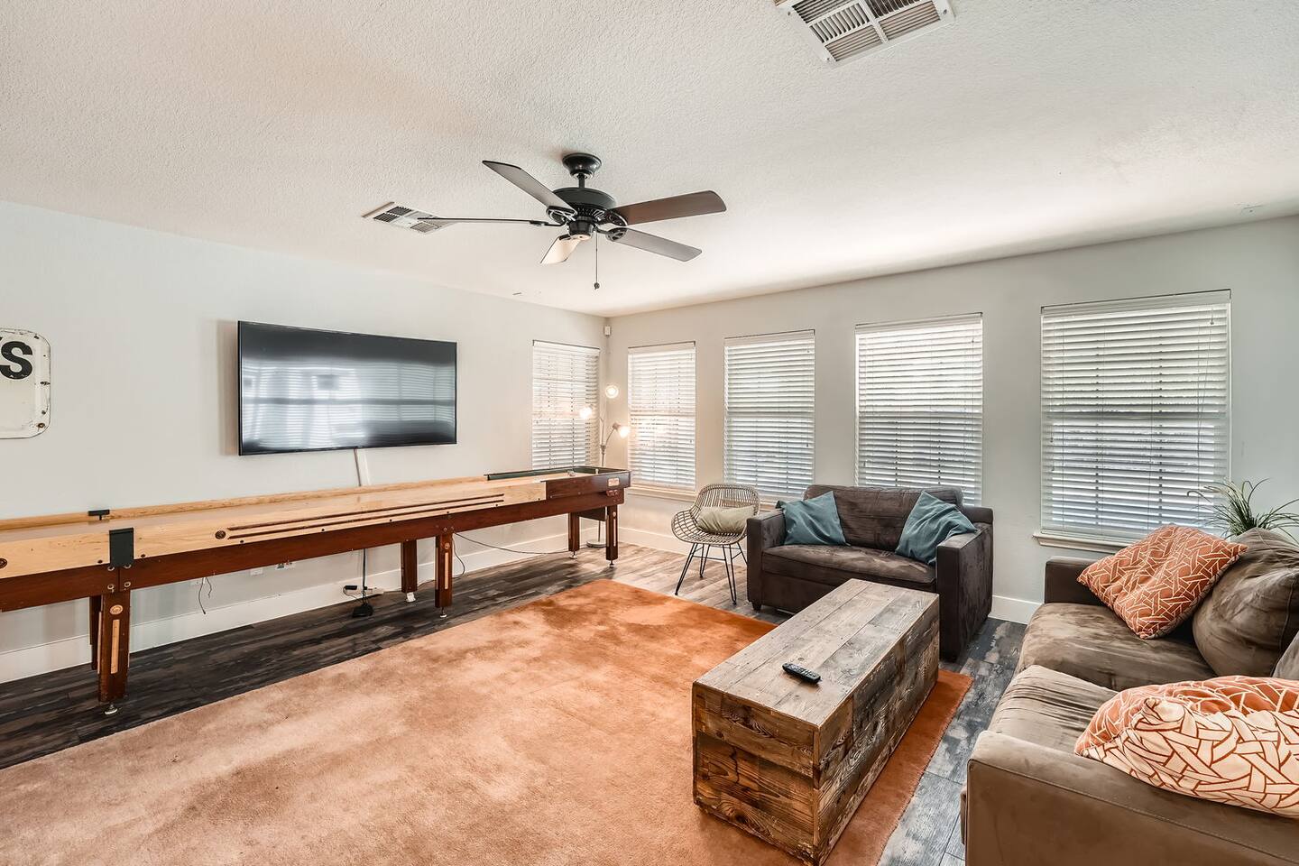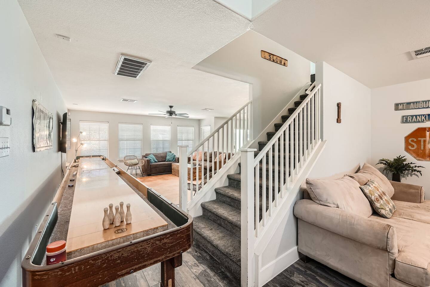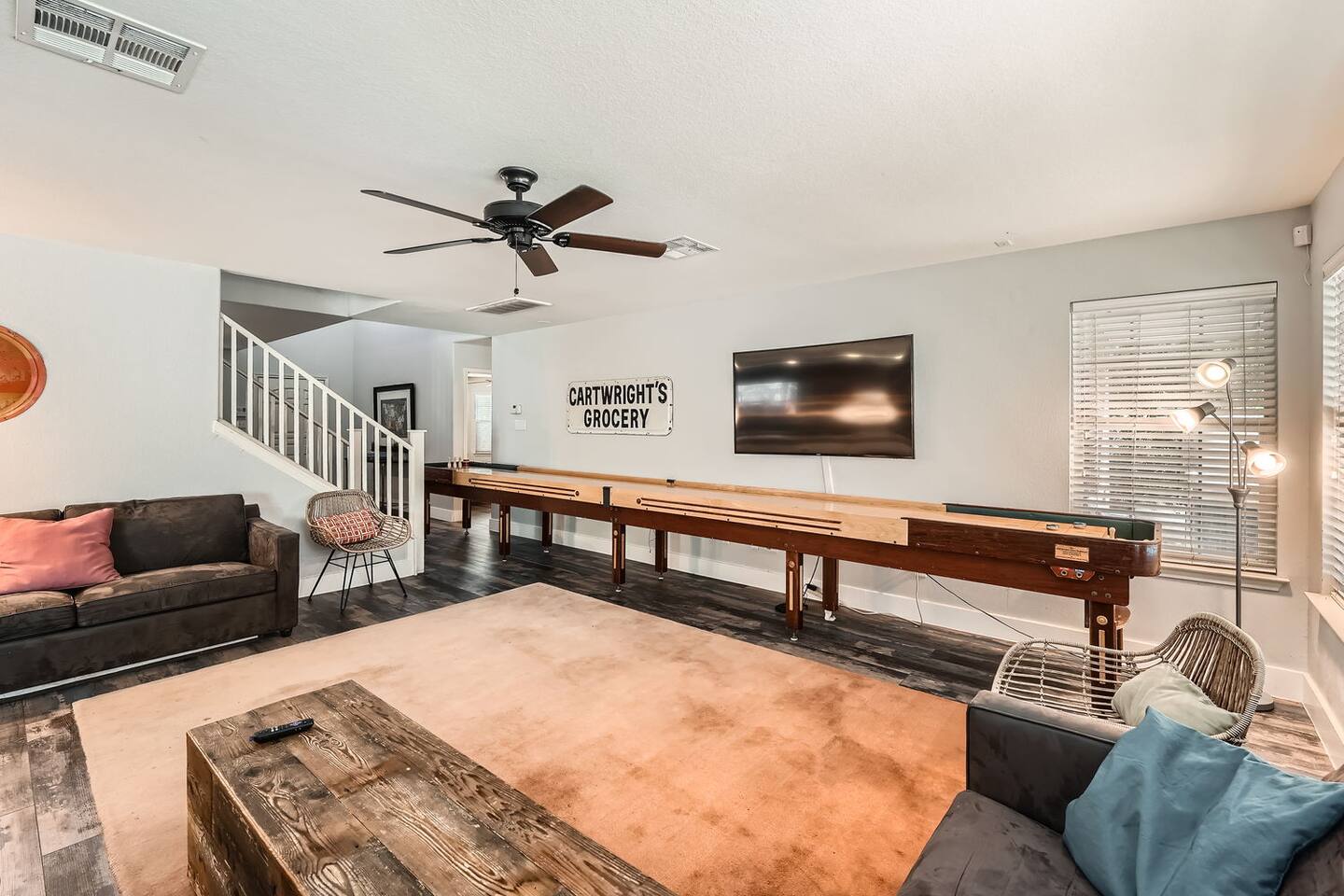 This house is a sprawling 5 bedroom house that goes on and on and on. Every square foot is tastefully decorated and set up for a comfortable stay for a group of 10 to 20+ and loaded to be the most fun house in Austin, Texas. Just take the shuffleboard table...not a puny 10 foot table...its 22 foot and handmade originally for Dave and Buster's. They said they paid $10,000 for the table when they sold it to me. We have an arcade that is an old Street Fighter game upgraded to have more than 3,000 games, a 4 player NBA Jam arcade, dual crusin car racing arcades, a Big Game Hunter arcade machine and an air hockey table in the converted game room. The pool and huge covered patio with 8 person LA Spa hot tub will be a hit. The kitchen is huge and fully loaded. The main TV is 65 inch curved 4k Samsung tv. I could go on and on! This is the house for you.